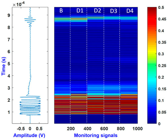 The noise signals were generated by the MATLAB randn function. This function was multiplied by a factor that determines the noise level. In the present study, this factor was equal to 0.01. For each acquisition, the randn function was called 200 times and added to the collected signal. Hence, a database of 1000 signals was generated (200 signals for the healthy state and 200 signals for each damage state). It is notable that each time the function randn was called, it generated different values but always with a zero mean and a standard deviation equal to the specified noise level. All the preprocessed signals (i.e., 1000) were gathered in a matrix and plotted in Figure 9 (right).
