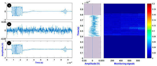 Figure 10 (left) shows an example of an original signal, a noise signal, and the corrupted signal (SNR = 19 dB). Note that, when the excitation echo and the end of pipe echo were excluded, the SNR drops to 3 dB. The matrix of data, obtained after removing the excitation and the end of pipe echoes, is shown in Figure 10 (right).