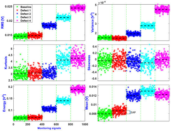 The result of the features provided in Section 2.2 is presented in Figure 11. In order to retain damage-sensitive features and exclude insensitive ones, feature selection was performed. This figure shows that the kurtosis and skewness had poor power of discrimination between all damage states. Consequently, these two features were excluded from the final set of relevant features. Energy and RMS had similar behavior towards the data. Thus, one of them was redundant and was removed (in this study, energy was discarded). Variance and mean had different behaviors and hence they were retained. Finally, the retained features were: RMS, variance, and mean.