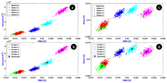 Clustering of collected data using two feature vectors: original clusters for (RMS, variance) (a), k-means clusters for (RMS, variance) (b), original clusters for (RMS, mean) (c), and k-means clusters for (RMS, mean) (d).