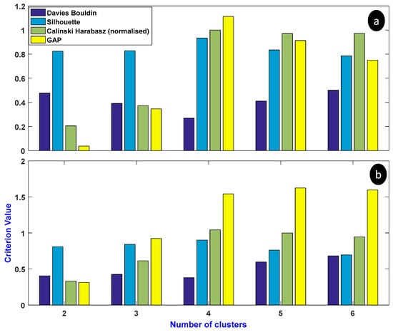 As mentioned previously, the k-means algorithm requires the number of clusters “k” as an input. However, it is always difficult to expect the optimal number of clusters, without calling some specific criteria. In the literature, different criteria can be found. For instance, the Calinski–Harabasz [26] clustering criterion is chosen when the Euclidean distance is used as metric to calculate distance between feature vectors (which is the case in this work). This criterion is based on the sums of squared Euclidean distances between the feature vectors and the centroids of the predicted clusters. The optimal number of clusters is then obtained by identifying the minimum value of this clustering criterion. Another clustering criterion is the Silhouette index [27,28]. This criterion is based on the difference between inter-cluster distances calculated as the smallest average distance between a feature vector and all the feature vectors of other clusters (the bigger the value of this distance corresponds to a good separation of clusters) and the intra-cluster distances are defined as the average distance between a feature vector and all the other vectors in the same cluster (the smallest value of intra-cluster distance corresponds to a better similarity between the feature vectors of the cluster). This value is then normalized to get the Silhouette index which is included in range. The Silhouette index evaluates the cohesiveness of a cluster. The optimal number of clusters is obtained by maximizing the value of this index. The Davies–Bouldin criterion [29] uses also the intra-cluster and the inter-cluster distances. This criterion processes each cluster individually and evaluates its similarity to the nearest cluster. Then, it calculates the mean value of these similarities, and in this case, the optimal number of clusters is obtained by minimizing this criterion in order to have low similarity between the clusters. Finally, the gap statistic criterion [30] is based on the logarithmical mean of the pairwise distances of all the feature vectors. It determines the optimal number of clusters by applying the “elbow method” [31].