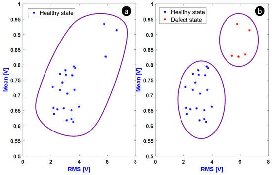 The proposed method in Figure 4 was implemented as an online clustering process. The 200 signals corresponding to Defect 1 were not used since they were overlapping with the 200 healthy signal states. To illustrate the working principle of the method, let us consider the example of N = 5 and = 2. The result of Figure 14a shows that the number of signals reaching the fixed was i = 3 while the persistence number N was not reached. Hence, the number of clusters is still k = 1. When the persistence number was reached, the number of clusters was incremented (k = 2) as shown in Figure 14b. As a result, the new cluster represented the presence of a defect.