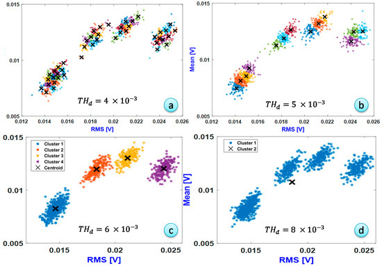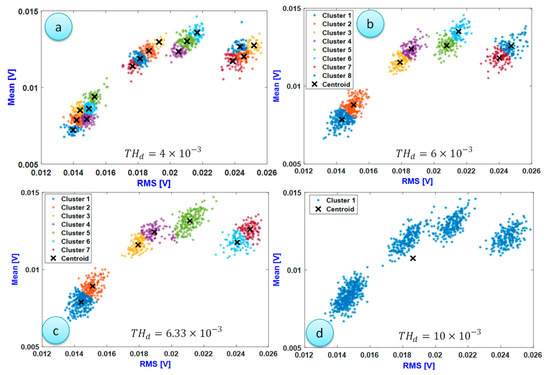In order to determine the optimal threshold distance value, it was changed from = 4 × 10−3 to = 8 × 10−3 with a step of 1 × 10−3. This range was graphically determined from the previous results shown in Figure 12. The persistence number was fixed at N = 3. The result in Figure 15d shows that a high value of kept all the signals in the same cluster and hence the number of clusters remained at k = 1. Therefore, this value of did not allow the detection of the damaged state clusters. When , as shown in Figure 15c, the resulting clustering process was close to the real cluster of signals.