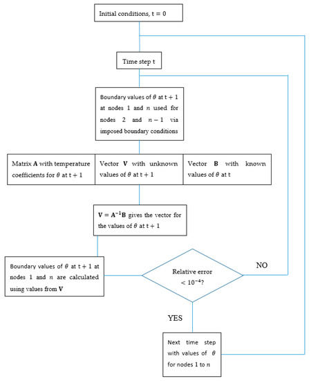 The model is solved by using a semi-implicit difference method for the spatial discretization and the forward Euler method for the temporal discretization for each time step . At the beginning of the simulation, the initial conditions are imposed. At a certain time , the equations for the temperatures are written in matrix form, , where is a matrix of dimension ( being the number of nodes in the discretized spatial domain, and two nodes being dedicated to the boundary conditions; the bulk equations are thus discretized on nodes), containing the coefficients of the temperatures at time , , a vector of dimension containing the unknown temperature values at the spatial nodes at time and being a vector of dimension containing the known temperature values at time . Due to the spatial gradients in the bulk equations, the values at nodes and depend on the boundary values at nodes and , respectively. The vector is calculated as . The boundary condition for the ballistic temperature at the hot side is imposed and held at that value at each time step. The boundary condition for the ballistic temperature at the cold side as well as the boundary conditions of the diffusive temperature at both sides at time are then obtained through the bulk values at time . This procedure is repeated until the relative errors of the bulk and boundary values of both the ballistic and diffusive temperatures between the previous and present loops become smaller than . The obtained values at time are stocked in the output matrix, and used as the known values for the next time step . This procedure is outlined in a schematic form in Figure 1.