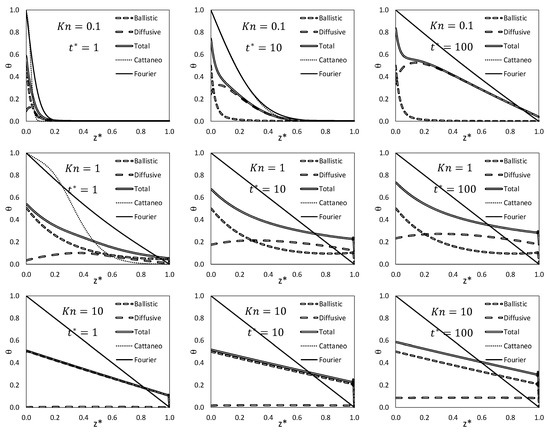 The quantity , which represents the temperature jump of the ballistic phonons at the face at , is taken as being equal to ½. This value may be understood statistically. Since the temperature boundary condition at actually represents an internal energy boundary condition, it can be said that the ballistic phonons that are generated at the heated face are formed by half of the carriers at the initial internal energy and the other half at the value , corresponding to the energy at the face where the temperature is suddenly increased. A discussion on this result can be found in [25], where it was mentioned that, by solving Boltzmann’s equation, at the heated boundary . A posteriori, it is shown later on that this value leads to results, which match satisfactorily well with other different approaches. Concerning the diffusive carriers, we assume that both of the interfaces are black phonon emitters and absorbers, implying that the boundaries are made of incident diffusive carriers only. Combining Cattaneo’s equation [23] and Marshak’s boundary condition [29,30] for black body thermal radiation, one obtains for :