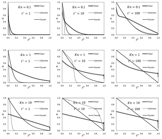 Non-dimensional temperature profiles as a function of distance at different times (, and , respectively) for , , and . The total temperatures from Figure 2 are compared to the ones obtained from Fourier’s and Cattaneo’s equations ((39) and (40)), using the effective thermal conductivity (38).
