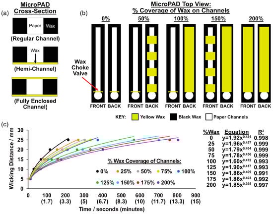 Paper-based channels with wax-printed fluidic time delays. (a) Diagram of MicroPAD cross-section displaying regular channels (exposed to ambient environment), hemi-channels (wax on one side), and fully-enclosed channels (wax on both sides). (b) MicroPAD top view diagram (front & back sides). The black wax represents a standard microPAD channel, while the yellow wax represents fluidic time delays (measured as % coverage of the paper channel). As shown, a fully-enclosed channel was defined as 200% wax coverage. The wax choke valve (not accounted for in % wax channel coverage calculation) was used to direct the fluid into the paper channel and prevent wicking along the top surface of the paper, which can negate the time delay effects of the wax printed features. (c) Graph of wicking distance over time (channel width = 3 mm, n = 3). A greater percentage wax coverage of channels resulted in decreased wicking rates. For example, it took 806 s (~13.4 min) for fluid to wick 25 mm in a 200% covered channel, and 216 s (~3.6 min) in a standard channel. Error bars were omitted for clarity, please see Table A1 for exact values and standard error.