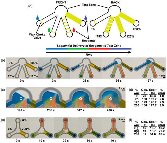 Sequential delivery of dyes to the test zone mediated by wax-printed fluidic time delays. (a) Conceptual diagram (front & back) of automated sequential delivery of reagents to a test zone. Wax-printed fluidic time delays depicted in yellow. The wax choke valve is used to direct the fluid into the paper channel. Colored dyes (8 µL), added simultaneously to the fluid reservoirs, arrive at the central test zone in a timed sequence (see colored bar below diagram). (b) Time lapse images of sequential fluid delivery on a microPAD with 4 channels (15 mm × 4 mm) and 0–200% wax coverage (diagramed in part a). Fluid applied to channels with lower wax percentages arrived first at the test zone. (c) Time lapse images of the test zone from the microPAD depicted in parts a and b. The four dyes arrive at the center of the test zone in the predicted sequential order, as indicated by the color of dye in the white circle at each time point. (d) Table of observed versus expected values for wicking times through each of the channels depicted in parts a–c. (e) Time lapse images of a microPAD with two channels with 0% wax coverage and one channel with 200% wax coverage (a total of three channels, each 7.5 mm × 4 mm) displaying the simultaneous arrival of two dyes (red & green) at the test zone from the 0% channels, followed by the later arrival of the third dye (blue) from the 200% channel. (f) Table of observed versus expected values for wicking times through each of the channels depicted in part e. Abbreviations: Obs. means observed, Exp. means expected, * means expected calculated based on the results from Figure 1c & Table A1. The dimensions of the channels and volumes of fluids used in the two experiments were different, however, these values allow for an approximate prediction of wicking time given the channel length and % wax coverage.