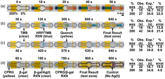 Automated multi-step enzymatic assays via wax-printed fluidic time delays. (a) Time-lapse images of sequential dye delivery in a microPAD with 2 channels (7.5 mm × 4 mm) (left channel = 200% wax, right channel = 0% wax). Red dye (right) enters test zone first (15 s), followed by the blue dye (left) (27 s). (b) Time-lapse images of an automated HRP assay (1.25 µL of 146 U/mL HRP deposited in test zone), followed by an H2SO4 quench. The HRP/TMB reaction first produces a blue color, and the acid quench produces a yellow color. (c) Time lapse images of an automated HRP assay with a lower amount of HRP deposited (1.25 µL of 14.6 U/mL HRP). This reaction produced a reduced color intensity as compared to the higher HRP concentration. (d) Time-lapse images of an automated enzyme inhibition assay for Ag(I) ion [23]. β-galactosidase was added to the right channel (0% wax), CPRG (colorimetric substrate for β-gal) was placed in the left channel (200% wax), and 1 ppm Ag(I) ion was deposited in the center test zone. β-gal inhibition by the Ag(I) ion indicates successful automation of the assay. Lighter yellow color in the 900 s images as compared to the 780 s image is due to the drying of the CPRG solution. Abbreviations: HRP refers to horseradish peroxidase, TMB refers to the colorimetric substrate for HRP, RXN means reaction, β-gal = β-galactosidase, CPRG refers to the colorimetric substrate for β-gal, Ag(I) =is silver (I) ion (heavy metal), Obs. means observed, Exp. means expected, * means expected calculated based on the results from Figure 1c & Table A1. The dimensions of the channels and volumes of fluids used in the two experiments were different, however, these values allow for an approximate prediction of wicking time given the channel length and % wax coverage.