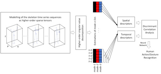 Significantly fewer works focus on action and gesture recognition adopting third-order tensor representations and modeling. Kim et al. [29] formed third-order tensors and applied tensor canonical correlation analysis to perform action and gesture classification in videos while Vasilescu and Terzopoulos [30] used higher-order tensors and their decompositions for face recognition. Koniusz, et al. [31] defined kernels on 3D joint sequences, which are linearized to form kernel descriptors. Then, tensor representations were formed from these kernels and were used for action recognition. More recently, Dimitropoulos et al. [32,33] took advantage of the correlation between the different channels of data and proposed a stabilized higher order linear dynamical system to extract appearance information and dynamics of multidimensional patches. However, the last method requires high computational cost making real-time action recognition nearly impossible. Furthermore, one of the challenges in these methods is how data could be effectively represented and fed to the developed classification systems.