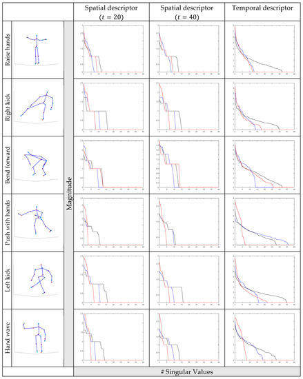 Distributions of three mode singular values (SVs) for the different human actions of CERTH [32] database. In the two first columns, the proposed spatial descriptors for