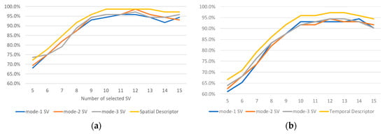 Action recognition rates of (a) Spatial Descriptor and (b) Temporal Descriptor using the first five to fifteen SVs and applying the proposed method to the CERTH dataset.