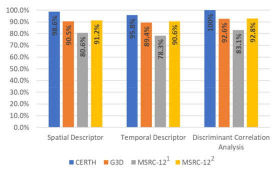 In this subsection, we elaborate a more detailed analysis to evaluate the contribution of different feature representations to the human action recognition. Specifically, we analyze the contribution of the two different descriptors, and we aim to show that the fusion of these features can improve the recognition rates. For the classification of the human actions, in the first case, we used the proposed spatial descriptor that achieves 98.6% and 90.5% for CERTH, G3D, and MSRC-12 datasets respectively. In the second case, we used the temporal descriptor that achieves lower accuracy rates than the spatial descriptor and achieves 95.8% and 89.4% for the two datasets. The performance of the proposed DCA method and the explanation of how the different descriptors contribute to classification rates are shown in Figure 5. It is clear that the fusion approach using the proposed spatial and temporal descriptors and a neural network for classification achieves 100%, 92.6%, and 83.1% classification rates for CERTH, G3D, and MSRC-12 datasets, respectively. The accuracy rates make evident that the individual feature representations contain complementary information and, therefore, the detection accuracy after fusion is increased.