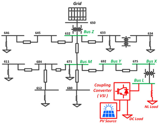 In order to evaluate the effect of a smart load on the distribution system, the smart load was connected on the IEEE 13-bus test feeder system. The test system was modified to include the smart load. Figure 1 shows the standard IEEE system under study, and the smart load was connected at bus 675. The network buses 632, 671, 692, and 675 were renamed as buses Z, M, Y, and X, respectively. The effect of imposing the smart load on the distribution system was studied on the pass from bus Z to bus L. The smart load contained a non-linear load, which was connected directly to bus L. The PV source and the DC load were connected to grid via a coupling converter. On the one hand, the converter worked to harvest the PV energy and drive the DC load, while the proposed control system will provide ancillary service and ensure the power quality at the point of the common coupling, which will positively impact the distribution grid.