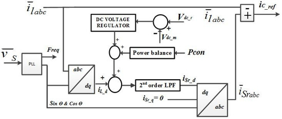 The main functions of the control technique are canceling the harmonics caused by the non-linear loads and compensating for the load unbalance caused due to the existence of single- and three-phase powered loads that are arbitrarily distributed and act as power factor corrector (PFC) at PCC. The proposed algorithm is based on a modified version from vector decoupled control in which the instantaneous three phases current was measured and transformed from ABC to DQ reference frame. This revised version of vector decouples control technique is capable of dealing with unbalanced and balanced systems. A block diagram depicting the control algorithm is shown in Figure 2.