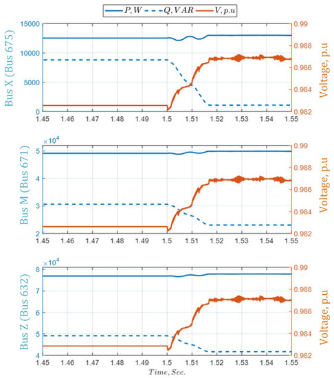 In this case study, the smart load control system is applied to t = 1.5 s. Moreover, the following figures depict the comparison between the IEEE 13-bus system before and after the smart load application. To show the improved performance after applying the smart load, Figure 3 shows the effect of the smart load on active power, reactive power, and voltage profiles at bus X, M, and Z. The results show that the active power capability for the whole pass of the smart load is increased.