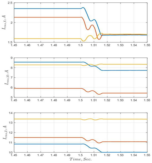 A comparison between three-phase current (RMS) at buses X, M, and Z, respectively.