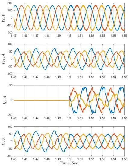 In addition, the reactive power at the same pass is reduced, which improves the power factor and the voltage profile at these points. Correspondingly, as shown in Figure 4, the unbalanced current ratio is diminished through the distribution bus pass, especially at point X. To clearly show the effect of the smart load application, the instantaneous values of three-phase voltages, load currents, coupling converter currents, and bus L injected currents are illustrated in Figure 5. The figure demonstrates that the non-linear load and the converter compensation current to balance the bus L (PCC) three-phase current.
