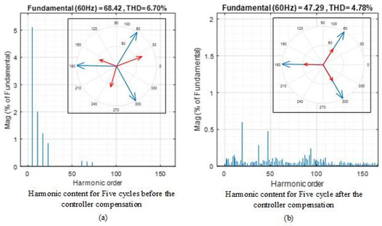 Analytically, Figure 6 illustrates the harmonic analysis and vector diagram for five cycles before and after the controller compensation effect. In Figure 6a, the total harmonic distortion was 6.7%. In addition, the current vector is not only unbalanced but also is shifted away from the voltage angle. On the other hand, Figure 6b shows the effect of the smart load control system; the total harmonic distortion is reduced to 4.78% with balanced current, and the power factor is improved toward unity.