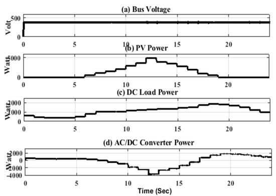 Simulation results: (a) direct current (DC) link bus voltage (V), (b) output power of photovoltaic (PV) system (Watt), (c) local DC load power (Watt), and (d) the grid tie converter power (Watt).