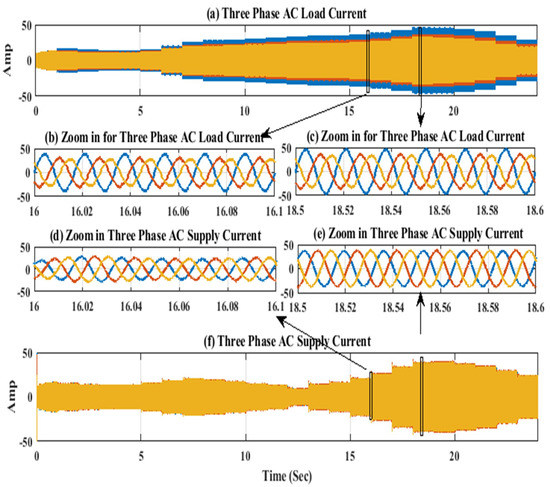 Simulation results: (a) alternating current (AC) load current, (b) zoom in for the AC load current between (16.0–16.1) s, (c) zoom in for AC load current between (18.5–18.6) s, (d) zoom in for AC supply current between (16.0–16.1) s, (e) zoom in for AC supply current between (18.5–18.6) s, and (f) AC supply current.