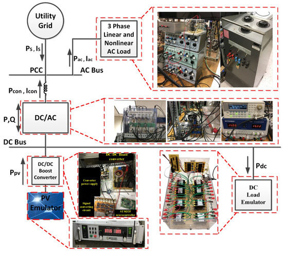 To investigate the feasibility of the proposed control technique, a hardware setup was established as depicted in Figure 9. The DC building was connected at the PCC through DC/AC converter. It was implemented in the power system test-bed (Energy System Research Laboratory, Florida International University) [31] and consisted of AC and DC zones connected through an AC–DC converter. The DC zone was represented by a DC bus, where its voltage was set to 380 V, along with a DC load emulator to represent load appliances connected to the DC side and a PV emulator to represent a roof-top PV source. The PV emulator, represented by XR SERIES DC power supply offered by the MAGNA-POWER ELECTRONICS, was programmed to emulate the PV I-V characteristics [32]. It was interfaced with the DC bus through a DC-DC boost converter to extract maximum power generated by the PV system. The mathematical modeling of the PV system and the converter MPPT controller were built within the MATLAB/SIMULINK environment and executed with the DSpace 1104 real-time interface. The DC load emulator was comprised of a combination of eight resistors with different values (1, 5, 10, 20, 30, 40, 50, and 60 Ω) in a particular arrangement [33]. In addition to these load resistor combinations, eight controlled switches were used to change the connection topology, which changed the values of the equivalent load resistors to obtain different load patterns. The central concept of operation was based on sending control signals to the switches to change their states (on/off). By changing their states, the equivalent load resistance changed. The control commands were generated from a load profile generator developed in the LabVIEW environment. The control commands were transferred through the PCI 6025E card to a circuit. This circuit was based on TEXAS INSTRUMENT inverting buffer module sn7406n. This module contained six inverters with open collector output. The RMS values for the voltage in the AC zone was set to 208 V. The AC bus was connected to the utility grid at PCC. Additionally, different load models were designed to represent the AC load pattern [34]. One of the passive loads that was built had a switching capacity of 10 levels parallel of resistive loads from 300-W to 3-kW power in steps of 300-W at a nominal voltage that could be switched to emulate various load patterns.