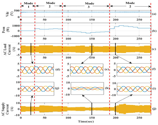 In response, the converter control verified its capability to control the bidirectional power flow between the DC building and the AC grid. The three-phase AC load and source currents are shown in Figure 10c–j, respectively. Figure 10d–f gives a close view of Figure 10c at modes one, two, and three, respectively. It is clear there is noticeable distortion in the current waveforms in relation to the existence of nonlinear loads. Figure 10g–i, give a close view of Figure 10j at modes one, two, and three, respectively.