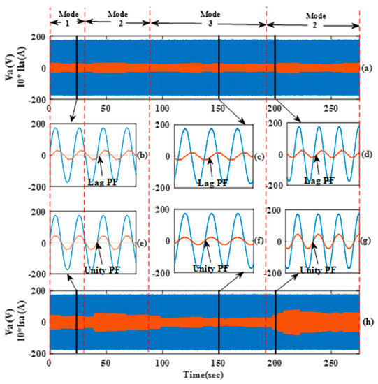 The controller has the capability to mitigate the harmonics and compensate for unbalances under all modes of operation. As is seen in Figure 10g–i, the three-phase currents at the source side are balanced. This indicates that the grid tie converter’s controller succeeded in cancelling out power quality issues (distortion and imbalance) from the source side. In order to validate the controller capability to improve the power factor, Figure 11 is shown. Figure 11a shows Phase A’s voltage versus Phase A’s load current. Figure 11h shows the Phase A voltage versus Phase A supply current. Figure 11b–d gives a close view of Figure 11a at modes one, two, and three, respectively. It is noticed that the current waveform is out of phase and lagging behind the voltage waveform, implying the involvement of a lag power factor. Figure 11e–g gives a close view of Figure 11h at modes one, two, and three, respectively. It can be seen that the current waveform is in phase with the voltage waveform, implying the involvement of unity power factor. Thus, the proposed control algorithm ID succeeds to correct the power factor for the system.
