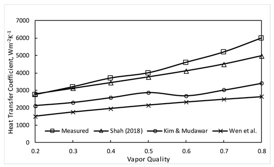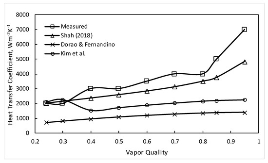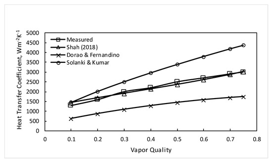 Numerous correlations have been published for heat transfer during condensation in channels. Most of them have been verified with very limited data, usually the authors’ own. Such correlations fail when compared to a wider data range. However, a few general correlations have been published which were verified over a very wide range of data. Notable among those for conventional channels are Dobson and Chato [22], Thome et al. [23], Cavallini et al. [24], and Shah [25,26]. The first three mentioned are applicable only to horizontal tubes and use the Nusselt formula for condensation outside horizontal tubes for calculating heat transfer at low flow rates where heat transfer becomes heat flux dependent. Heat transfer on the upper part of tube is calculated with the Nusselt equation while heat transfer of liquid flowing at the bottom is calculated with a forced convection equation. These correlations require that heat flux be known for comparing them with test data. The Shah correlation uses the Nusselt formula for condensation in vertical tubes in the heat flux dependent regime and does it in a way that heat flux is not needed for comparison with test data. The Shah correlation is applicable to horizontal as well as vertical down flow while the other three are applicable only to horizontal flow.