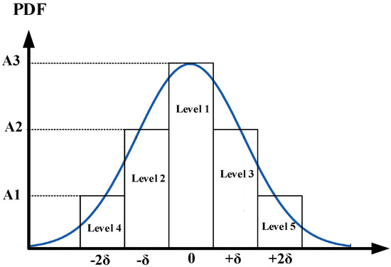 Fitness proportionate selection is one of the most popular ways of parent selection. The general idea is that every individual can become a parent with a probability which is proportional to its fitness. Therefore, fitter individuals have a higher chance of mating and propagating their features to the next generation. Such a selection strategy favors the more fit individuals in the population, resulting in better individuals over time. In our approach first the PDF is divided into several probability levels based on the required precision. Each of them represents the error rate on that section. For example, the PDF in Figure 2 is divided into 5 levels.