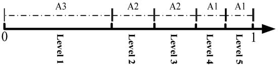 In Figure 3, the roulette wheel was divided into 5 pies according to the levels considered in the PDF. The intended length for level 1 is A3, which is 70% of the total length of the line. The intended length for Level 2 and Level 3 is A2, which is 10% of the total length of the line and the length for the level 4 and level 5 is equal to A1, which is 5% of the total length of the line. As shown in Figure 3, the sum of the probabilities of the levels is equal to one.