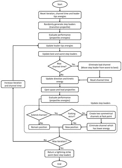 where is initial speed; is the mass and is the light speed; is the traveled path and is the rate of ionization. The smaller mass of a projectile and shorter path traveled means the larger space it can explore, as the velocity and the ionization ability are higher. Hence, the relative energy of the step leaders determines the power of exploration and the utilization capacity of the LSA. The algorithm uses three different types of particles. The transition projectile begins to populate the search for solutions. The space and lead projectiles are engaged in exploration and they attempt to find and exploit the optimal solution. This results in three different search methods that are deployed. Exponential random behavior is executed by the space projectile that attempts to become the step leader. Opposition theory is used to realize the concurrent formation of two leader tips at fork points. Finally, local search is conducted by the lead projectile that is meant to represent the best positioned projectile that originated from a number N of step leaders [44,46]. In Equation (17), a random variable modeled by uniform PDF, expresses an ejected projectile in a random direction.