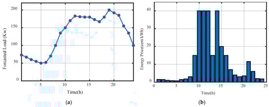 (a) The forecasted load for 24 h in the underlying microgrid; (b) time-of-use price for a 24 h period [47].