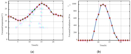 The price of the power exchanged with the main grid is considered as Time-of-Use (TOU) price, which is shown in Figure 6b. Various scenarios for TOU pricing can be considered. But the one that encourages consumers to shift their consumption to non-peak hours with the low-cost electricity is acceptable, since it can maximize the profitability. The minimum price of power is less than 2 cents per kilowatt and the maximum is 40 cents per kilowatt. As mentioned earlier the power produced by PVs depends on the intensity of the radiation by the sun and the ambient temperature. The predicted values of those two parameters are shown in Figure 7. According to Figure 7b, solar power extraction is only possible from 8 a.m. to 18 p.m., and for the rest of the day, due to the lack of radiation intensity, the PV power output will be zero. The maximum intensity of the radiation of the sun in the studied region at 12 o’clock is approximately 1000 watts per square meter. The ambient temperature also varies from 15 to 30 °C.