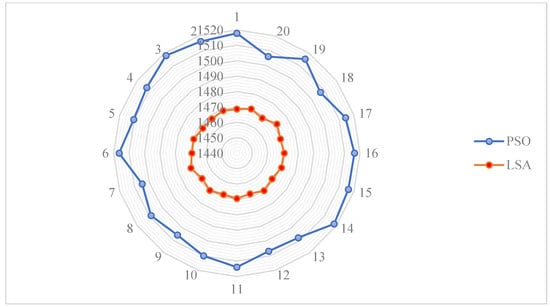 In Figure 9, the values of the best solution for 20 trials of the algorithms are shown. All the results (costs) obtained by the LSA are less than the PSO results. Additionally, the LSA responses are closer to each other. The lowest and the highest costs after optimization by the LSA is obtained with 1467.4 € in the fourth trial and 1472.1 € in the 18th trial. While the costs after optimization by the PSO are changed in the broader range. The lowest cost for the PSO is achieved in the seventh trial and it is about 1504.7 €. The worst solution for the PSO is 1518.3 € which is obtained in the third trial.