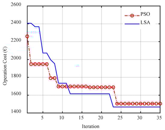 Given the uncertainties, different cost amounts in different scenarios are obtained by varying the demand and solar and wind power outputs. There is a significant difference between costs due to the uncertainty in production and consumption. The cost difference between the third and the fourth scenario is more than 320 €. The lowest cost is obtained in scenarios in which the demand was rather low; i.e., when it is possible to sell electricity to the upstream network. The minimum cost in ten scenarios is obtained in scenario S3, which is estimated 1521.6 € for the PSO algorithm and 1507.5 € for the LSA algorithm. The maximum cost of the microgrid in the defined scenarios, if optimized by the PSO algorithm, is equal to 1842.6 € and, if optimized by the LSA algorithm, is calculated at 1833.4 €. The standard deviations of the responses obtained by both algorithms are rather small, but the standard deviations in the responses of the proposed LSA are roughly half of the standard deviations of the PSO algorithm, which confirms the high accuracy of the proposed LSA.