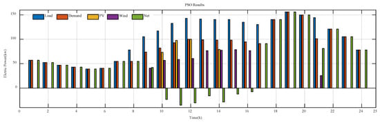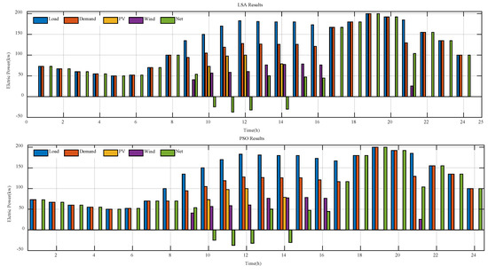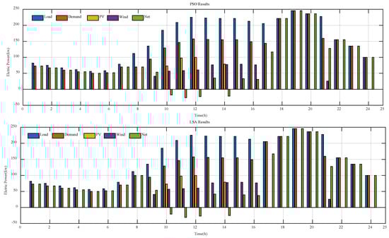 In the following, the amount of power generated by EGs along with the amount of energy purchased from the network in 24 h, is optimized by PSO and LSA. Figure 15 and Figure 16 show the results obtained for the third (S3) and fourth (S4) scenarios, respectively.