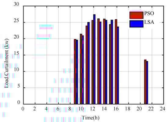 The difference between the predicted demand and the loads estimated by scenarios is in the finite range of −36.8 KW in hour 13, and 32.8 KW in hour 20. The PSO and LSA are used to manage the resource energies and determine the amount of load curtailment.