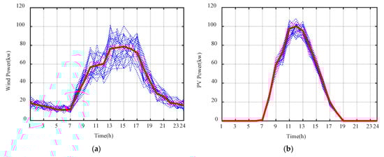 WT (a) and PV (b) power outputs in 50 scenarios.