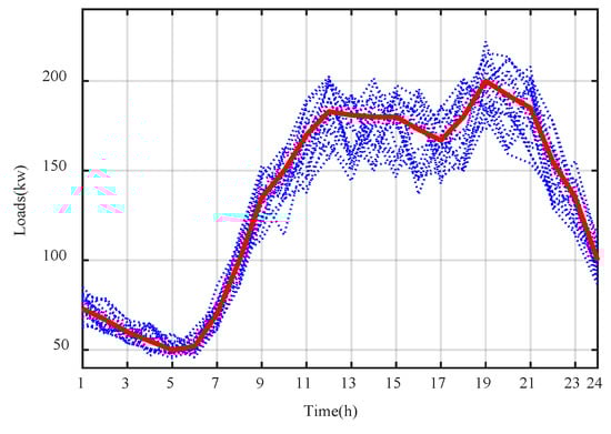 In Figure 13, the forecasted power is shown by the bold red line and the power output of various scenarios are shown with blue points. The maximum difference between the forecasted output power of EGs and the scenarios is in the finite range. The maximum deviation for solar power ranges from −24.3 kilowatt to 25.36 KW, and for wind power is −24.4 to 25.36 KW. Figure 14 shows the amount of electrical energy requested by households over a period of 24 h in different scenarios.