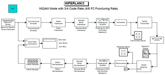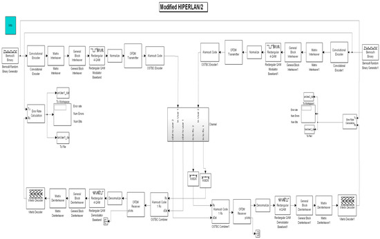 The model of HIPERLAN/2 that exists in the MATLAB consists of several stages; the first stage is the Bernoulli random generator that generates the binary data depending on the probability of zero, followed by the convolutional coder, which codes the data by using one of the polynomials that can be written by using the command (poly2trellis(3, [7 5])). At the same time, the encoder can do the puncturing of encoded data. The third part is the interleaver, which interleaves the data using two types of interleavers (matrix interleaver and equation interleaver). The interleaving perform of the matrix interleaver is done by filling a matrix with symbols row by row, then sending the filled data column by column, whereas equation interleaver rearranges the data depends on specific equation that determine the symbol position without omitting any symbols. The fourth stage is the modulator, which modulates the data using m-modulation scheme, then the output symbols from the modulator will be normalized before sending it by using OFDM transmitter [14,15]. These stages represent the transmitting part. There is a channel of Additive white Gaussian noise (AWGN) type between the transmitter and the receiver. The receiver consists of the OFDM receiver, demodulator, two stages of deinterleavers, and Viterbi decoder. The receiver components work opposite to those components in the transmitter side.