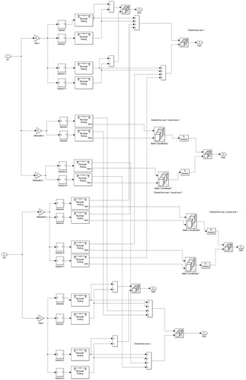 More details of the channel box in Figure 3 is shown in Figure 4 and Figure 5 when the number of transmitting and receive antennas is varying. Figure 4 show the channels when the users have two transmit antennas and one receiver antenna, whereas Figure 5 shown the channels when each user has two transmit antennas and two receiver antennas. The channel modelling depends on the gain and attenuation block diagram, where the gain block will be used to model the channels between the transmit and the receive antennas within the same user, whereas the attenuator will be used to model the channels between the transmit and the receive antennas between the users. As a result, the receiver antenna of the first user received two signals; the signal transmitted by the same user and the signal transmitted by the other user in addition to the noise. It can be noticed from Figure 4 and Figure 5 that the transmitted symbols for the first user will be amplified by using a gain block. After that, the amplified symbols will be transmitted through the Rayleigh channel [18,19]. Meanwhile, the transmitted symbols by the second user will be attenuated by the same gain block. However, the amount of the gain will be less than one; in this case, the gain will be attenuation. The next stage is to send the attenuated symbols through other independent channels.
