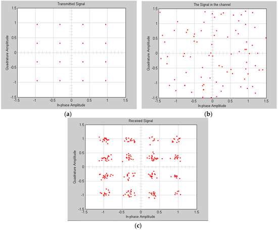 HIPERLAN/2 system shown in Figure 2 is tested when the 16QAM modulation is used. Figure 6 shows the symbols scattering for different stages: (a) at the transmitter side, (b) inside the channel, and (c) at the receiver side. It can be noticed that the channel has a significant effect on the transmitted symbols.