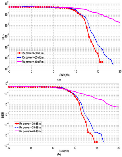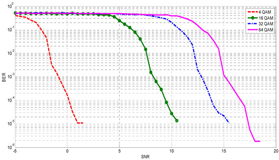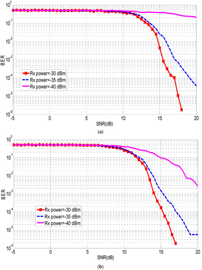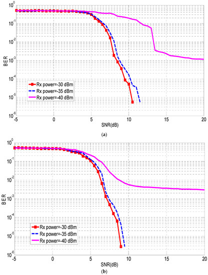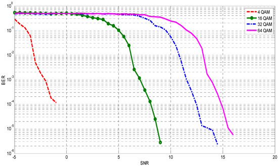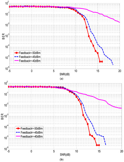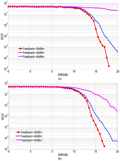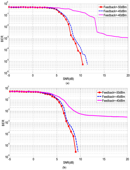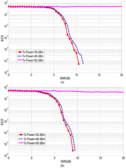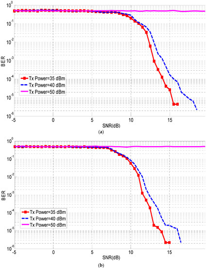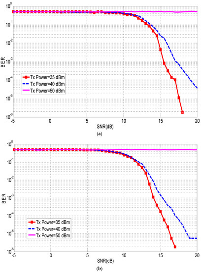 Finally, the proposed system was tested when the received power and the feedback accuracy are constant, and only the transmitted power is varying for different cases, as shown in Figure 15, Figure 16, Figure 17. It is obvious that the transmitted power affects the system performance, whereas at 50 dBm transmitted power, the system was not able to recover the original signal even when there is a high SNR. However, as the transmitted power decreases, the overall performance is improved. At the same time, less SNR will be enquired as the modulation scheme is reduced.