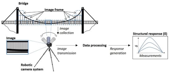 A robotic camera system (RCS) is developed to collect accurate static and quasi-static structural response of an entire structure. A case of (a) static response is when a structure is loaded for a short period such as static calibrated load testing of a bridge with strategically positioned trucks [22]; (b) quasi-static response is when temperature loads force structures or their parts to expand or contract. A vision of an RCS application for the collection of bridge response for its condition assessment is given in Figure 1. The RCS is located at a suitable distance to the bridge, which depends on the camera lens, accessibility, and other factors. Close image frames of the entire bridge or selected parts of it are captured at regular intervals. Images are sent to a data storage unit, from which the data is processed. The structural response is the output of steps involved in the data processing phase. The response can then be analyzed for anomaly events and the structure’s health. The robotic camera system and steps involved in the data processing phase are provided and discussed in the following subsections.