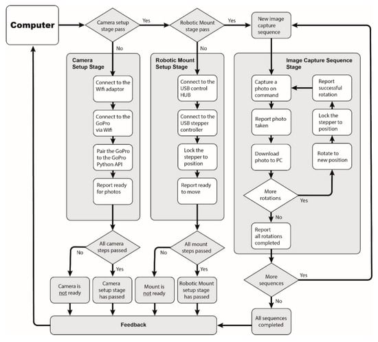 Software control is done using Python scripting, which follows the flowchart with pseudo-steps in Figure 3. Image sequences and camera rotations are set by the user. They can be either finite (via time limit or total image sequence/camera rotation limits) or infinite (the system continues capturing image sequences until a manual user break). The GoPro Application Programming Interface (API) for Python is an open-source software module that enables the connection and control of a GoPro camera via a Wi-Fi connection. During the setup, if the camera or robotic mount is not ready, the setup process is terminated, and the user receives an error message requesting manual corrections of the faults. At a no-fault scenario, the RCS proceeds with capturing image sequences. The rotation angles for each image sequence are predetermined by the user in advance of the experiment and are coded into the Python script. The camera rotation is visually judged by the user so that each new region of structure is in the frame of each new image.