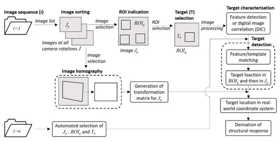 Data processing steps for deriving the structural response from the images collected with the RCS are shown in Figure 4. A data folder for each image sequence or assumed time step (), which can last as long as required to capture the entire structure or a part of it, is created. Collected images are sorted following the camera rotation (), and an image list is created. The first image sequence is assumed to represent the baseline conditions of the structure, in which (a) regions of interest (ROI) and targets are identified, (b) targets are characterized, (c) and image homography for each is computed.