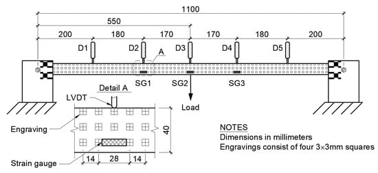 A simply supported timber beam with the length, width, and height of 1000 mm, 20 mm, and 40 mm, respectively, serves as a testbed for the performance evaluation of the proposed RCS. The beam has rectangular laser engravings mimicking structural targets such as bolts in steel bridges. Engravings are four 3 mm × 3 mm squares with a 14 mm offset in both horizontal and vertical directions. The load is applied manually placing weights at the mid-span of the beam. The following load steps are considered: 0 N, 50 N, 75 N, 85 N, 90 N, 85 N, 75 N, 50 N, and 0 N. Structural response is collected at 1 Hz with five linear variable differential transformers or displacement sensors (denoted as , where ) and each load step with three foil strain gauges (, where ). Figure 5 is a sketch of the beam with the contact sensing system.