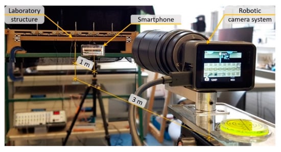The performance of the proposed camera system is evaluated on a laboratory structure. The paper is structured as follows: Section 2 introduces the robotic camera system (hardware and software) and the data processing strategy, which includes data sorting, image processing, and response generation; in Section 3 the performance of the camera system is evaluated on a laboratory beam; Section 4 discusses the experimental findings, provides a vision of an enhanced three-axis robotic gimbal and gives an insight to future research; and Section 5 draws the main research findings.