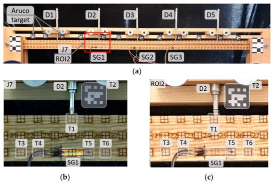 Annotated images collected with vision-based monitoring systems. (a) A cropped image captured with a smartphone. Sensor names are provided next to sensor locations. The red rectangle shows the part of the beam captured at J7 and in ROI2. (b) and (c) targets and sensor locations in J7 and ROI2, respectively.